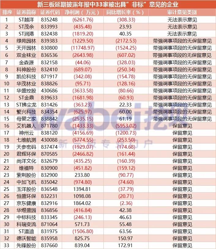其中ST越洋(835248)、ST茂余(833993)、ST潤港(832438)3家企業(yè)被出具“無法表示意見”;包括ST金鼎(839633)、ST拂塵龍(831426)在內(nèi)的12家企業(yè)被出具“帶強(qiáng)調(diào)事項(xiàng)段的無保留意見”;包括ST溫迪(831975)、玉洋股份(836548)在內(nèi)的18家企業(yè)被出具“保留意見”。