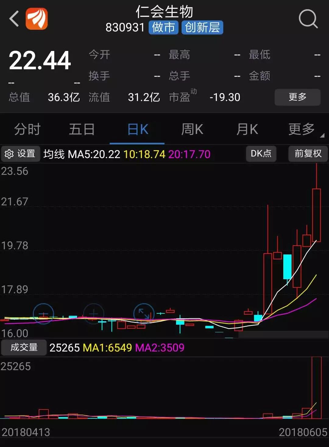 5月28日,仁會生物宣布擬申請終止掛牌,此舉被市場解讀為是為赴港上市做準備。次日仁會生物股價大漲17.6%,成交373萬元;6月1日、6月5日又分別大漲7.77%、9.73%。