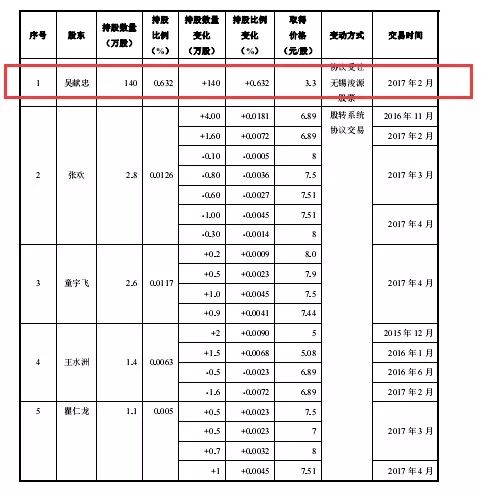 2017年2月,龍利得股東無錫浚源將其于2016年下半年認購的140萬股公司股票按照成本價3.3元/股轉讓給了吳獻忠。挖貝網(wǎng)從龍利得招股書中了解到,同期買入公司股票的自然人股東張歡、童宇飛等人通過股轉交易的價格均在6元/股以上。