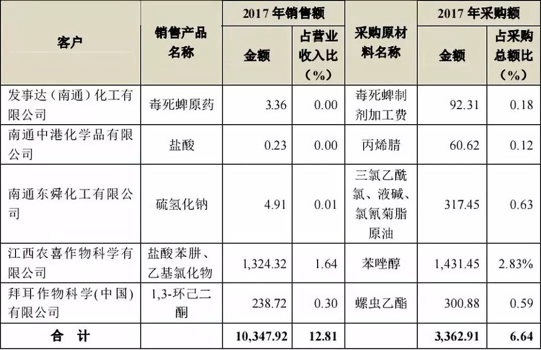 其中2017年,新農(nóng)股份向山東濱農(nóng)科技有限公司銷售3,4二甲基苯胺等產(chǎn)品7687萬元,占當(dāng)期營業(yè)收入的比重為9.5%;同時向山東濱農(nóng)科技有限公司采購原材料534萬元,占當(dāng)期采購總額的1.06%。