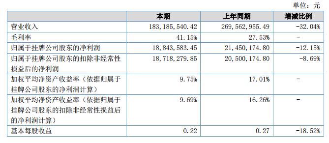 報(bào)告期內(nèi),醇醚汽油產(chǎn)品銷售收入達(dá)到121,083,268.43元,較去年同期增長(zhǎng)69.76%;其他化工原料產(chǎn)品銷售收入壓縮至22,147,756.49元,較去年同期下降83.22%;醇醚柴油產(chǎn)品受市場(chǎng)行情波動(dòng)影響,上半年銷售收入為39,954,515.5元,較去年同期下降39.67%。受此影響,2018年上半年公司實(shí)現(xiàn)營業(yè)收入183,185,540.42元,較去年同期下降32.04%;毛利率41.15%,較去年同期增長(zhǎng)13.62個(gè)百分點(diǎn);歸屬于掛牌公司股東的凈利潤18,843,583.45元,較去年同期下降12.15%。?