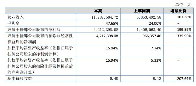 報告期內(nèi)公司完成營業(yè)收入總額1,178.76萬元,與上年同期相比增長101.38%,實現(xiàn)營業(yè)利潤561.65萬元,與上年同期相比增長299.83%。?