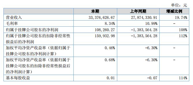 報告期內(nèi),公司實現(xiàn)營業(yè)收入33,376,626.67元,與上年同期相比增長19.74%,營業(yè)成本為30,595,203.43元,與上年同期相比增長23.32%,營業(yè)利潤本期為-330,276.86元.與上年同期相比增長45.73%,凈利潤為108,260.27元,上年同期凈利潤為-1,383,564.28元,增加1,491,824.55元.凈利潤增長率為108%.經(jīng)營活動產(chǎn)生的現(xiàn)金流量凈額為11,359,547.79元,與上年同期相比111.38%,截止2018年6月30日公司總資產(chǎn)額為136,368,288.42元,凈資產(chǎn)23,784,310.02元.?