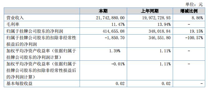 公司實現(xiàn)收入21,742,880.00元,同比增長8.86%。報告期內(nèi)公司營業(yè)成本19,248,783.87元,毛利率11.47%,上年同期毛利率13.94%。報告期內(nèi)歸屬于掛牌公司股東凈利潤414,655.08元,上年同期348,018.84元同比增長19.15%。?