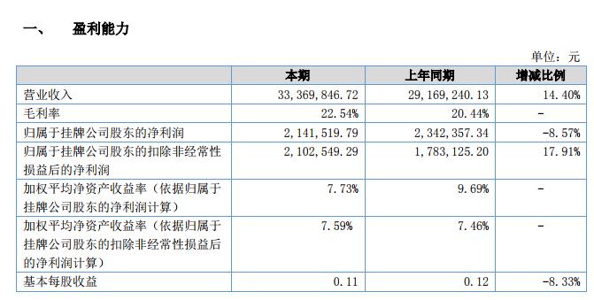 在報(bào)告期內(nèi),公司 2018 年 1-6 月實(shí)現(xiàn)營(yíng)業(yè)收入 33,369,846.72 元,比上年同期增長(zhǎng) 14.40%;2018 年 1-6 月實(shí)現(xiàn)利潤(rùn)總額 2,952,952.48 元,比上年同期增長(zhǎng) 8.58%;公司總資產(chǎn)為 48,425,646.30 元,凈資產(chǎn)為 28,772,966.52 元,較上期期末相比均有小幅增長(zhǎng),以上數(shù)據(jù)表明,公司財(cái)務(wù)狀況及盈利水平較上期水平平均均有較大提升。