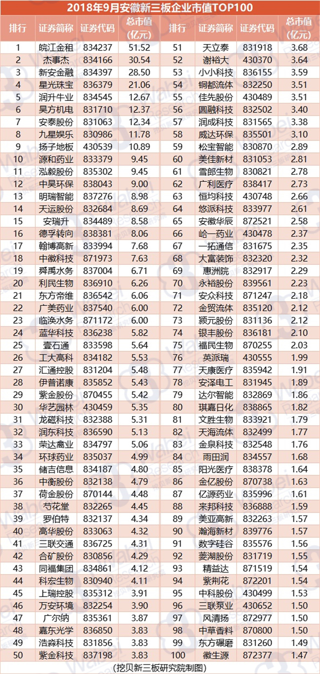 附:2018年9月安徽新三板企業(yè)市值TOP100