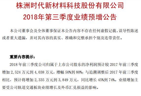 時(shí)代新材稱,經(jīng)財(cái)務(wù)部門初步測(cè)算,預(yù)計(jì) 2018 年前三季度凈利潤(rùn)與上年同期相比,將增加 2524 萬元到 4038 萬元,達(dá)到7572萬元到9086萬元,同比增長(zhǎng) 50%到 80%;扣除非經(jīng)常性損益的凈利潤(rùn)與上年同期相比,將增加 2737 萬元到 4561 萬元,同比增長(zhǎng)180%到300%。