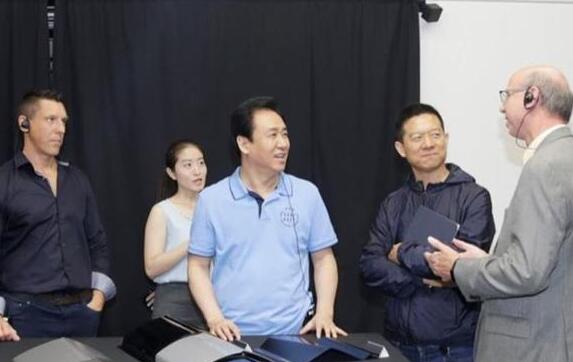 7月初雙方“閃婚”,穿淺藍(lán)色上衣的許家印坐在FF91里幸福滿滿,賈躍亭在身后微笑陪同。